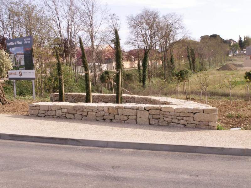 Aménagement paysager. Pierres de ré-emploi. Par mesure de sécurité (lieu public), le couronnement a été lié à la chaux par l'entreprise maitre d'oeuvre.
